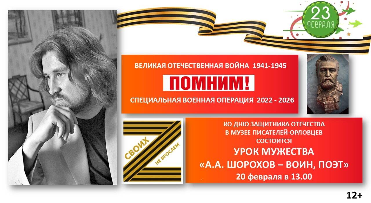 В рамках реализации проекта «Литературная гостиная: Поэзия и проза современных писателей-орловцев: А. А. Шорохов» в музее писателей-орловцев состоится урок мужества «А. Шорохов. «Воин-поэт».