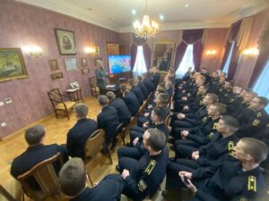 Ирина Владимировна рассказала о прекрасном поэте-орловце Евгении Аграновиче, поэте-песеннике Алексее Фатьянове, чья судьба также связана с Орлом; познакомила курсантов с некоторыми поэтическими произведениями на тему войны нашей землячки Елены Благининой.