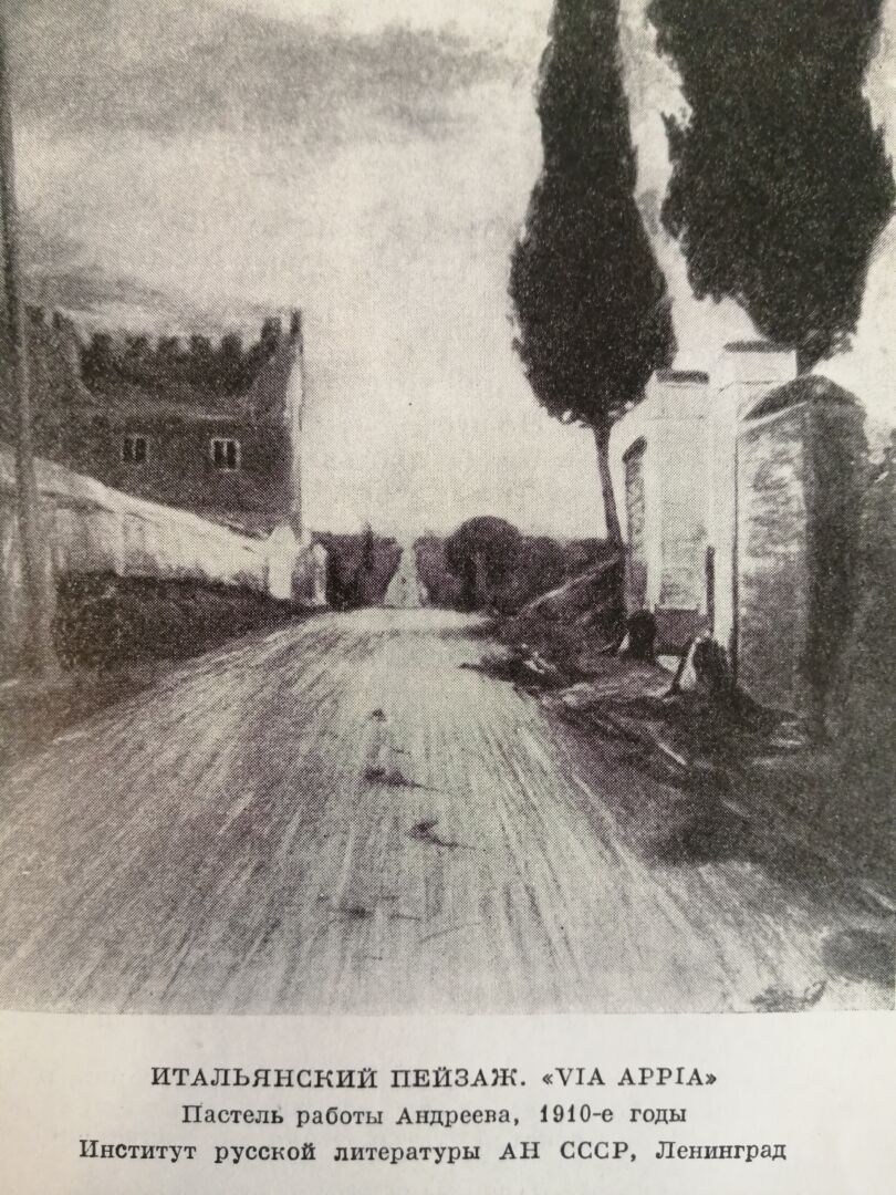 Во время путешествия Леонид Николаевич не только фотографировал, но и сделал несколько рисунков. Итальянский пейзаж «VIA APPIA» представлен в «Литературном наследстве» (т. 72).