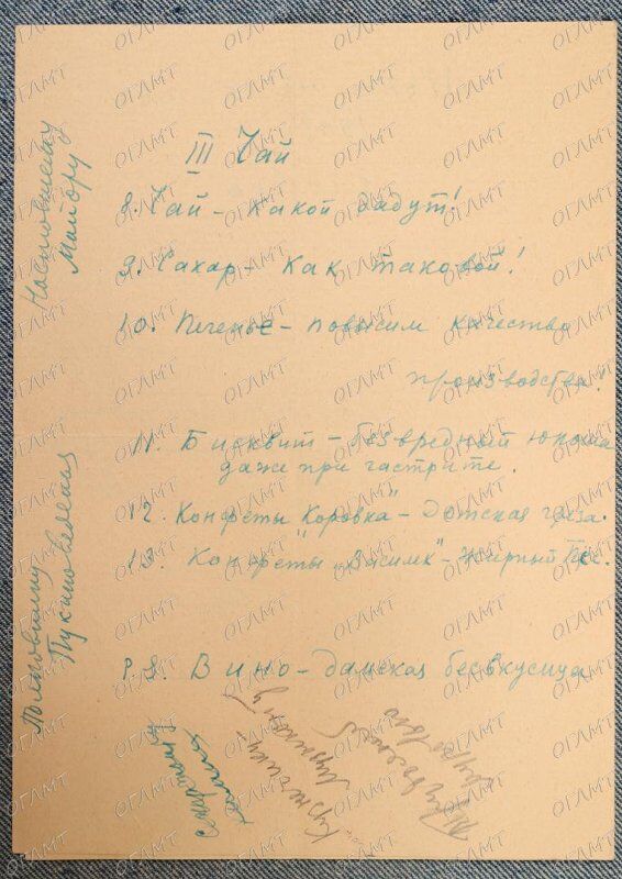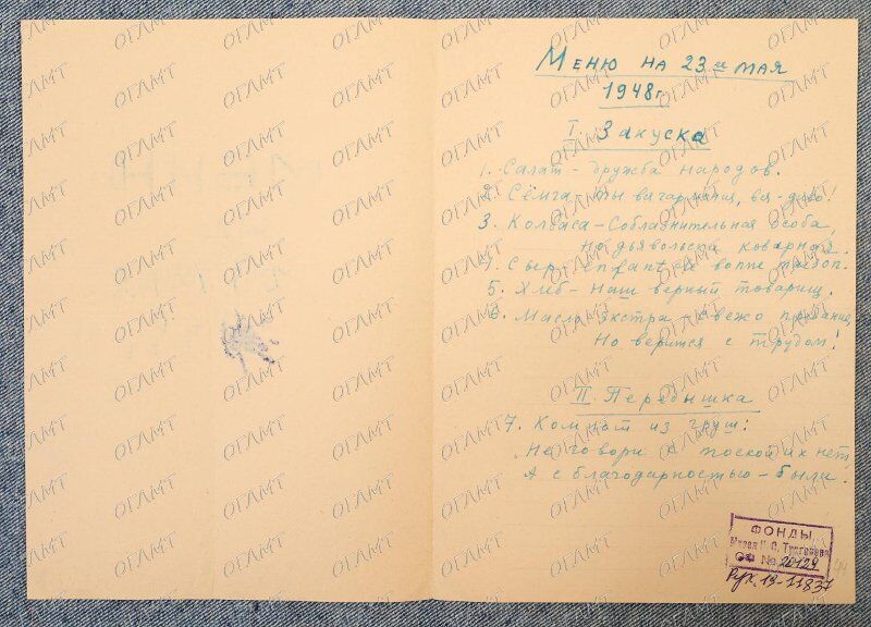 Показывает весёлый нрав Ивана Алексеевича и его жены «Шуточное меню на 23 мая 1948 года и на праздничное торжество (в ночь с 13 на 14 января 1953 года)». Оно было составлено Новиковым для жены и сегодня хранится в фондах ОГЛМТ. Меню включает три раздела — «Закуска», «Передышка», «Чай» и интересные характеристики, и сравнения некоторых продуктов питания и блюд. Так, например, колбасу Новиков сравнивает с «соблазнительной особой, но дьявольски коварной», а хлеб называет «нашим верным товарищем». Бисквит писатель характеризует, как «безвредного юношу, даже при гастрите», а вино – «дамской безвкусицей». Благородную рыбу сёмгу Новиков соотносит с поэтичными словами, близкими к А.С. Пушкину – «ты вся гармония, вся диво», а вкусный компот из груш ассоциирует со строчкой из стихотворения Василия Жуковского «Воспоминание»: «не говори с тоской их нет, а с благодарностию – были».