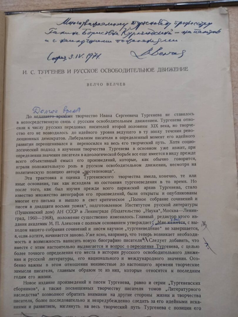 В 50-80-е годы XX века в области тургеневедения были широко известны имена выдающихся ученых из разных стран: А. Гранжара, П. Ваддингтона, А. Звигильского, Н. Жекулина, В. Велчева и мн. др. Среди материалов, полученных Госмузеем И.С. Тургенева в Орле от наследников профессора Г.Б. Курляндской, мы обнаружили оттиск статьи болгарского филолога академика В.П. Велчева «И.С. Тургенев и русское освободительное движение» с автографом автора.