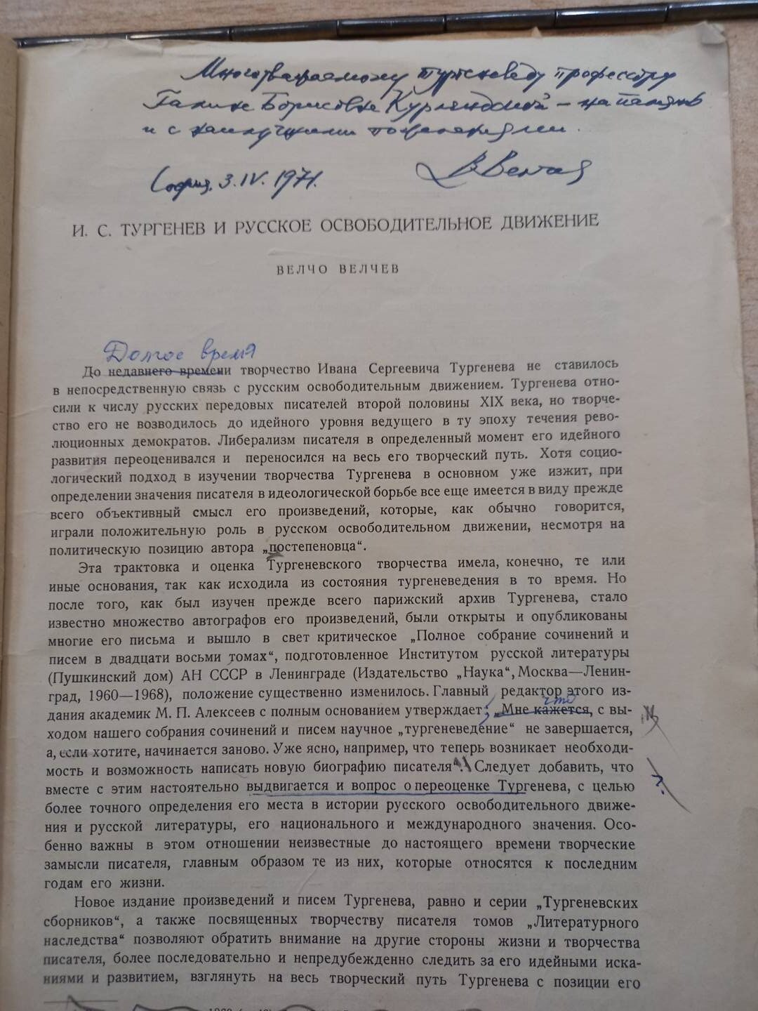 В 50-80-е годы XX века в области тургеневедения были широко известны имена выдающихся ученых из разных стран: А. Гранжара, П. Ваддингтона, А. Звигильского, Н. Жекулина, В. Велчева и мн. др. Среди материалов, полученных Госмузеем И.С. Тургенева в Орле от наследников профессора Г.Б. Курляндской, мы обнаружили оттиск статьи болгарского филолога академика В.П. Велчева «И.С. Тургенев и русское освободительное движение» с автографом автора.