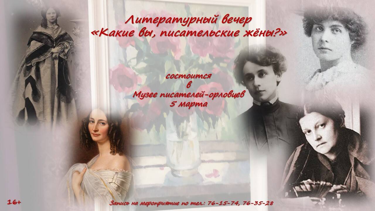 5 марта в 15:00 в канун праздника женщин в музее писателей-орловцев состоится вечер: «Какие вы, писательские жёны…», посвященный женам писателей. От жён часто зависит вдохновение, творческая и личная судьба писателей. Не случайно Б. К. Зайцев сказал, что «жизнь не может быть лёгкой и безгрешной, но женщина может тянуть вверх или вниз».