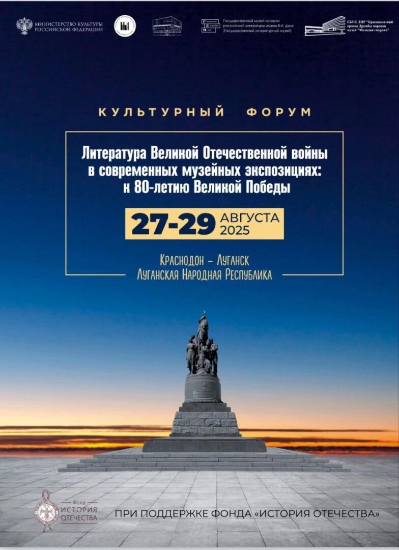 27-29 августа в Краснодоне и Луганске проходит масштабный Культурный форум «Литература Великой Отечественной войны в современных музейных экспозициях: к 80-летию Великой Победы», объединивший историков, филологов, культурологов, музейных работников из Москвы, Санкт-Петербурга, ЛНР, ДНР, Ростовской, Курской, Белгородской, Орловской, Воронежской, Калининградской областей России.