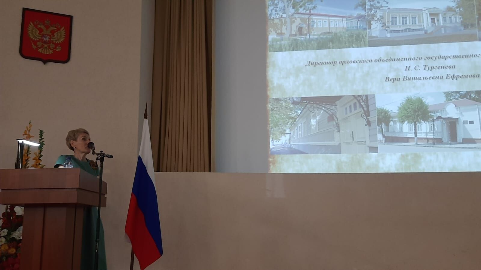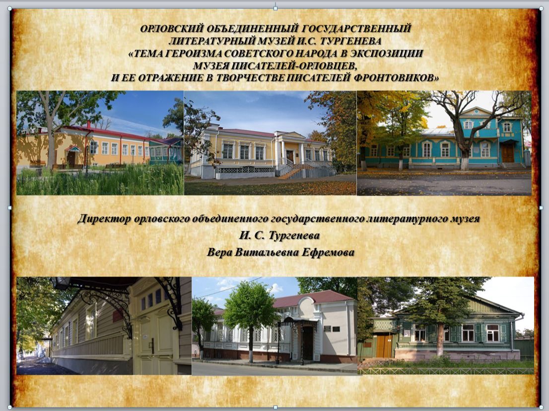 Директор Орловского объединенного государственного литературного музея И.С. Тургенева Ефремова Вера Витальевна обобщила опыт Музея писателей-орловцев в своем выступлении «Тема героизма советского народа в экспозиции Музея писателей-орловцев, и ее отражение в творчестве писателей фронтовиков».