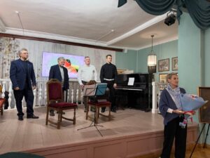 Вечер украсило художественное чтение отрывка из сказа «Левша» в исполнении руководителя театральной студии «Маскарад» С.А. Семённика, сопровождавшееся красочным видеорядом.
