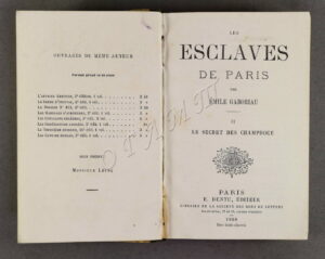 Книги, отданные в переплет, оформлены в едином стиле, без излишеств – тканевый корешок, фрагмент родной обложки приклеен на переплетную крышку. Принадлежность брату писателя можно установить благодаря экслибрису (конгревное тиснение). Так же их можно объединить по характерному содержанию и единому стилю оформления от издательства. Часть книг не переплетены и сохранили первозданный вид. Среди изданий с экслибрисом мы видим «первопроходца» детективного жанра Эмиля Габорио, произведения Доде, А.Бело, Гюстава Флобера, Э.Золя и др. Можно говорить о бульварной литературе, можно назвать это классикой жанра… В любом случае, это часть истории французской литературы и «картина эпохи». Основная тематика сохраняется и среди книг без владельческих знаков (общее направление содержания, выходные данные — место, издательство, год, серия), которые я позволила себе отнести к единому блоку и объединить для создания каталога, с которым вы можете ознакомиться на с.2-51 по адресу: https://turgenevmus.ru/edinaya-fondovaya-kollektsiya/katalogi-opisi/