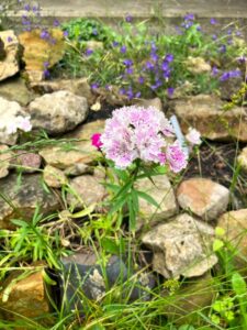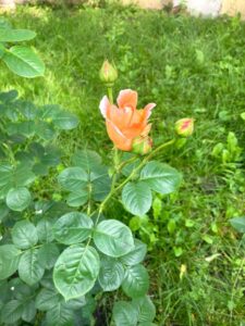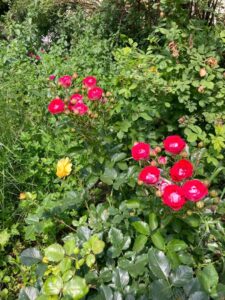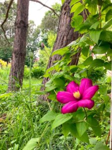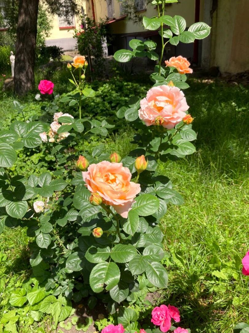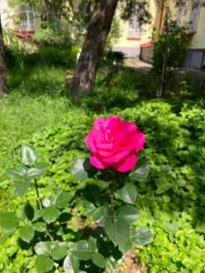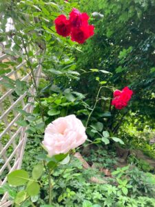 Помнится, молодой сад, разбитый у дома Ивана Сергеевича в Баден-Бадене, изобиловал розами, вот и наш Маменькин садик, несмотря на дождливый и холодный июнь, вошёл в пору цветения роз. Среди них есть особенно дорогие нашему сердцу розовые кусты из Спасского и плетистые розы, привезённые из Чеховского сада в Крыму. А в тенистых местах нашего садика расцвели не менее прекрасные грациозные фиолетовые клематисы и нежные бело-розовые гвоздики.