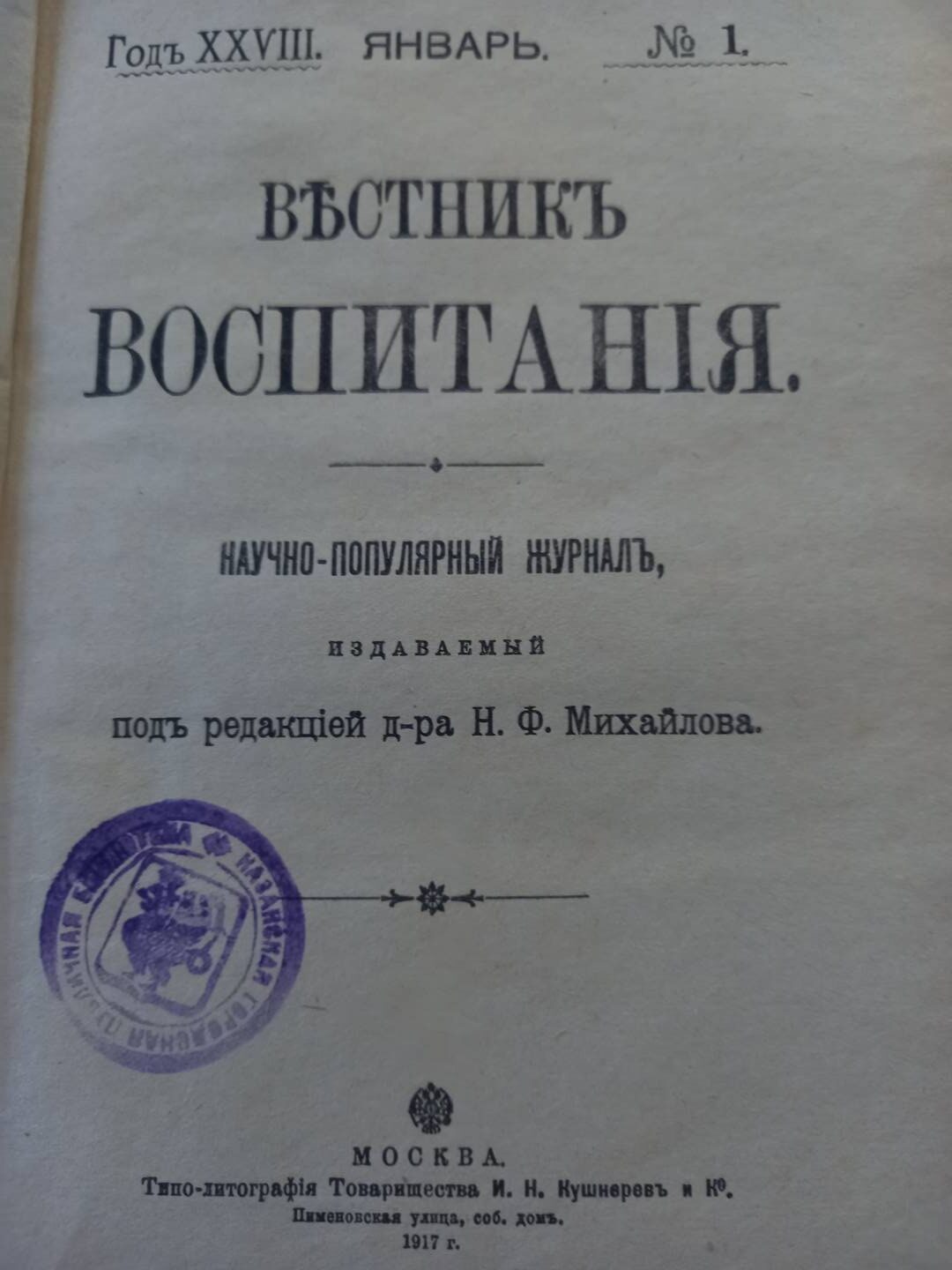 Для тех исследователей, кто интересуется книжной коллекцией нашего музея, мы дадим краткий обзор материала из «Вестника воспитания» за 1917 год (№ 1).