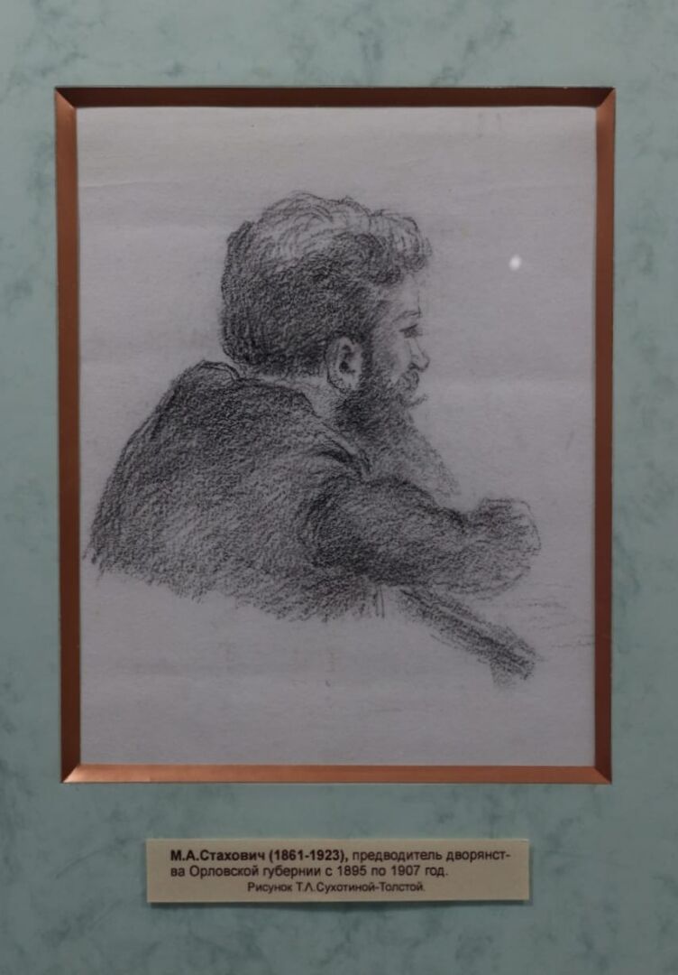 На выставке представлены: портрет Л.Н. Толстого работы Леонида Андреева, карандашный рисунок сына писателя Л.Л. Толстого (портрет отца); портрет М.А. Стаховича работы Т.Л. Сухотиной-Толстой. Портреты А. А. Фета, И. С. Тургенева, И. А. Бунина, И. А. Новикова, Л. Н. Андреева,