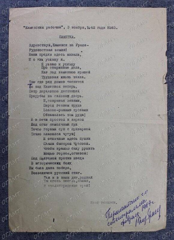 На Урал Новиков приехал в начале октября 1942 года. И уже через месяц выступал в зимнем клубе Уралалюминстроя на торжественной сессии Исполкома городского совета депутатов трудящихся. Об этом сообщает газета «Каменский рабочий» от 9 ноября 1942 года: «После доклада выступили ряд стахановцев предприятий, а также писатель-орденоносец И. А. Новиков». А незадолго до этого в той же газете было опубликовано стихотворение писателя «Памятка», в котором он приветствует Урал: