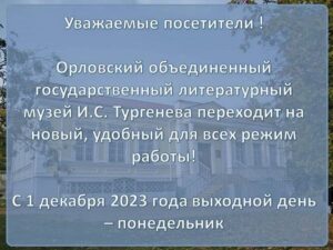 Уважаемые посетители! Орловский объединенный государственный литературный музей И.С. Тургенева переходит на новый, удобный для всех режим работы! С 1 декабря 2023 года выходной день –