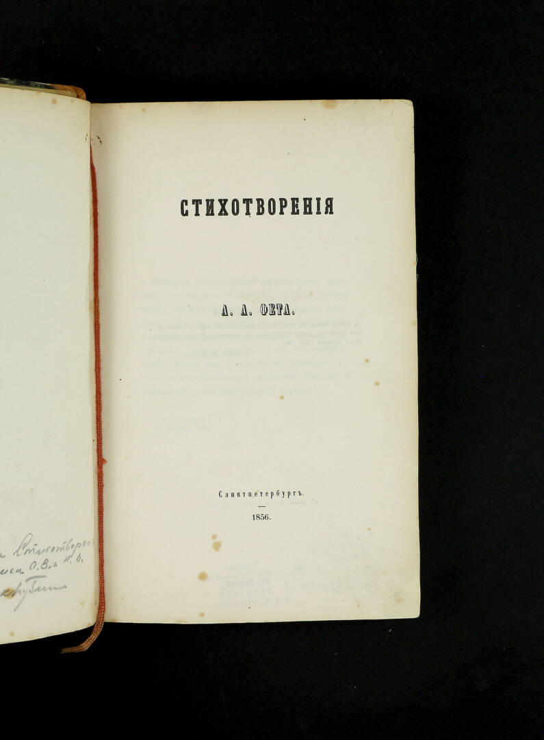 В музее писателей-орловцев, в красивом шкафу фетовского зала можно увидеть прижизненный сборник стихотворений поэта, вышедший под заглавием «Стихотворения А.А. Фета» в 1856 г. Посетитель не обратит особого внимания на сборник, т.к. внешне он совсем невзрачный, но именно он послужил Фету ориентиром для последующих изданий.